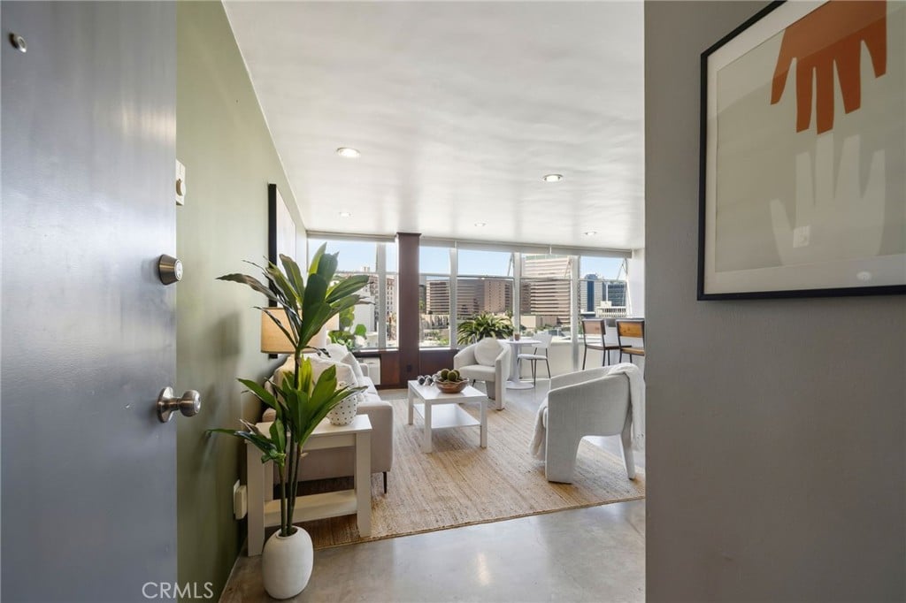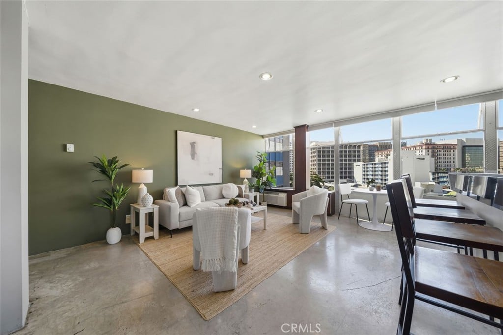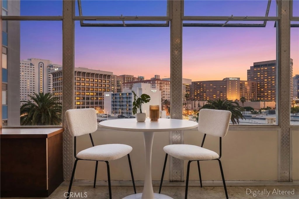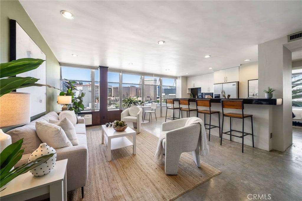 If you are looking for a hip, artsy loft vibe with epic views just a couple blocks from the beach this is IT! The unit is located on the 6th floor with sprawling city views from the kitchen and palm tree tops right outside the bedroom windows. The Royal Palms has an impressive secure entrance right off Atlantic with facial recognition and double fob entrance, courtyard and modern lobby. Jump in the elevator and find yourself entering a southwest facing corner unit with wall to wall glass overlooking the city. Fisher & Paykel appliances, polished concrete floors and a beautifully remodeled bathroom. Belly up to the bar stools and watch the sunset and enjoy this open loft concept. Parking is available directly across the street and paid for by the seller for the whole first year of ownership. Cool off in the pool and catch some rays in one of the outdoor seating areas. This building is very pet friendly and so are the residents!